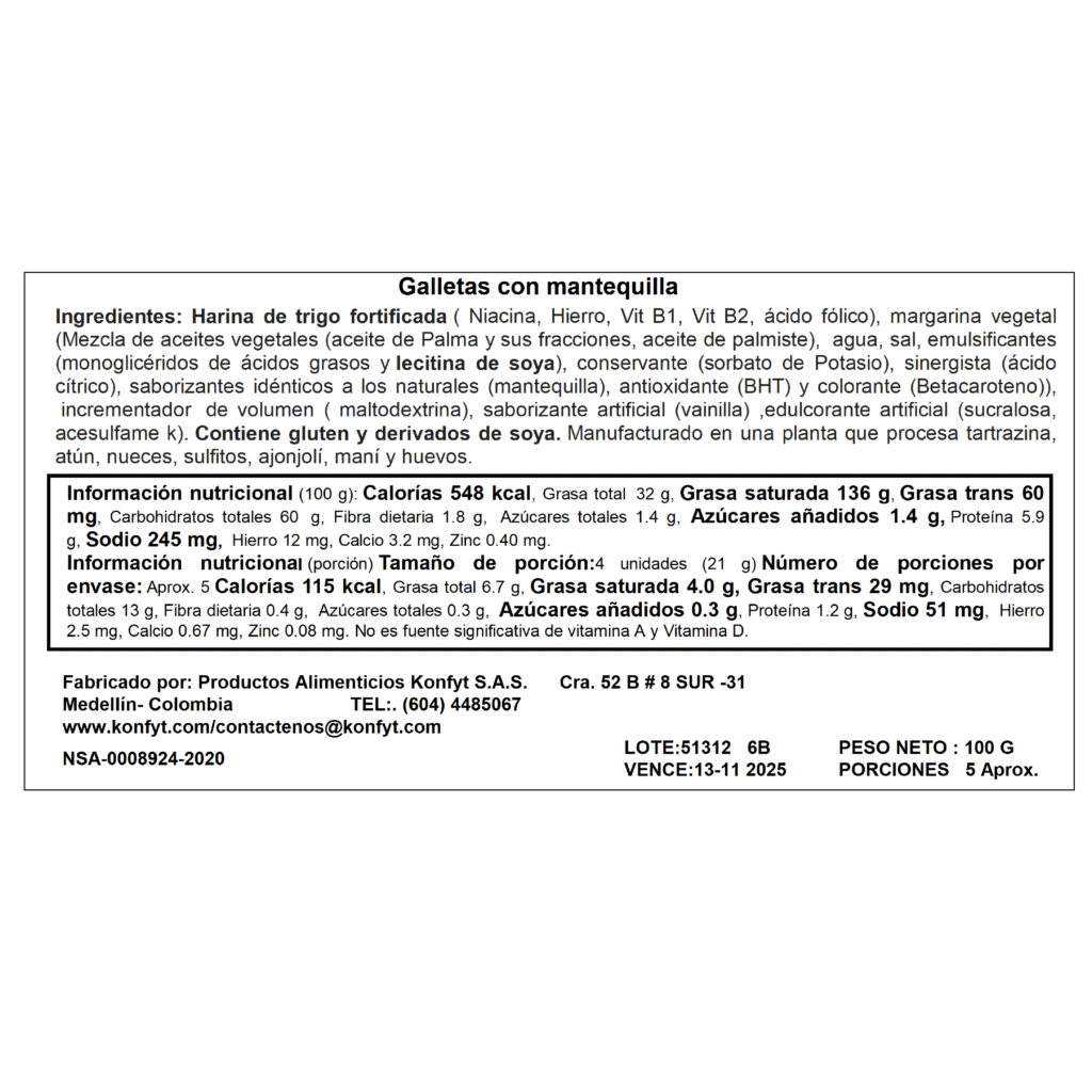 Ingredientes: Harina de trigo fortificada ( Niacina, Hierro, Vit B1, Vit B2, ácido fólico), margarina vegetal (Mezcla de aceites vegetales (aceite de Palma y sus fracciones, aceite de palmiste), agua, sal, emulsificantes (monoglicéridos de ácidos grasos y lecitina de soya), conservante (sorbato de Potasio), sinergista (ácido cítrico), saborizantes idénticos a los naturales (mantequilla), antioxidante (BHT) y colorante (Betacaroteno)), incrementador de volumen ( maltodextrina), saborizante artificial (vainilla) ,edulcorante artificial (sucralosa, acesulfame k).