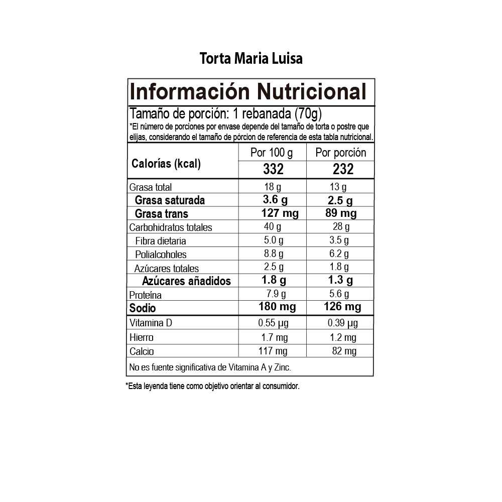 Ingredientes Torta: Huevos, harina de trigo fortificada (Niacina, Hierro, Vitamina B1, Vitamina B2, Ácido fólico) , aceite de girasol, incrementadores de volumen (maltodextrina, polidextrosa), humectante (sorbitol), leche entera en polvo, leudantes ( pirofosfato de sodio, bicarbonato de sodio, fosfato monocálcico), sabor artificial (mantequilla), emulsificante (lecitina de soya), conservante (sorbato de potasio), edulcorantes artificiales (sucralosa, acesulfame k), regulador de acidez (fosfato disódico). Contiene gluten, huevos, leche.